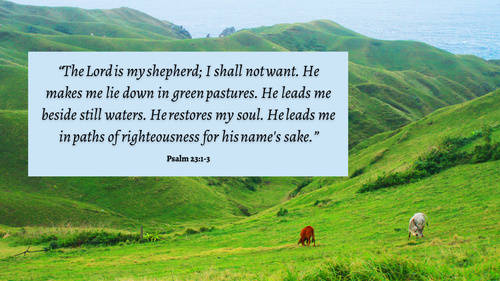 “The Lord is my shepherd; I shall not want. He makes me lie down in green pastures. He leads me beside still waters. He restores my soul. He leads me in paths of righteousness for his name's sake.” – Psalm 23:1-3