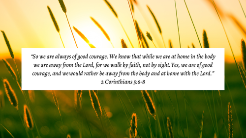 “So we are always of good courage. We know that while we are at home in the body we are away from the Lord, for we walk by faith, not by sight. Yes, we are of good courage, and we would rather be away from the body and at home with the Lord.” - 2 Corinthians 5:6-8