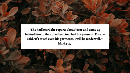 “She had heard the reports about Jesus and came up behind him in the crowd and touched his garment. For she said, ‘If I touch even his garments, I will be made well.’” - Mark 5:27