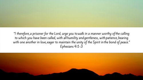 “I therefore, a prisoner for the Lord, urge you to walk in a manner worthy of the calling to which you have been called, with all humility and gentleness, with patience, bearing with one another in love, eager to maintain the unity of the Spirit in the bond of peace.” – Ephesians 4:1-3